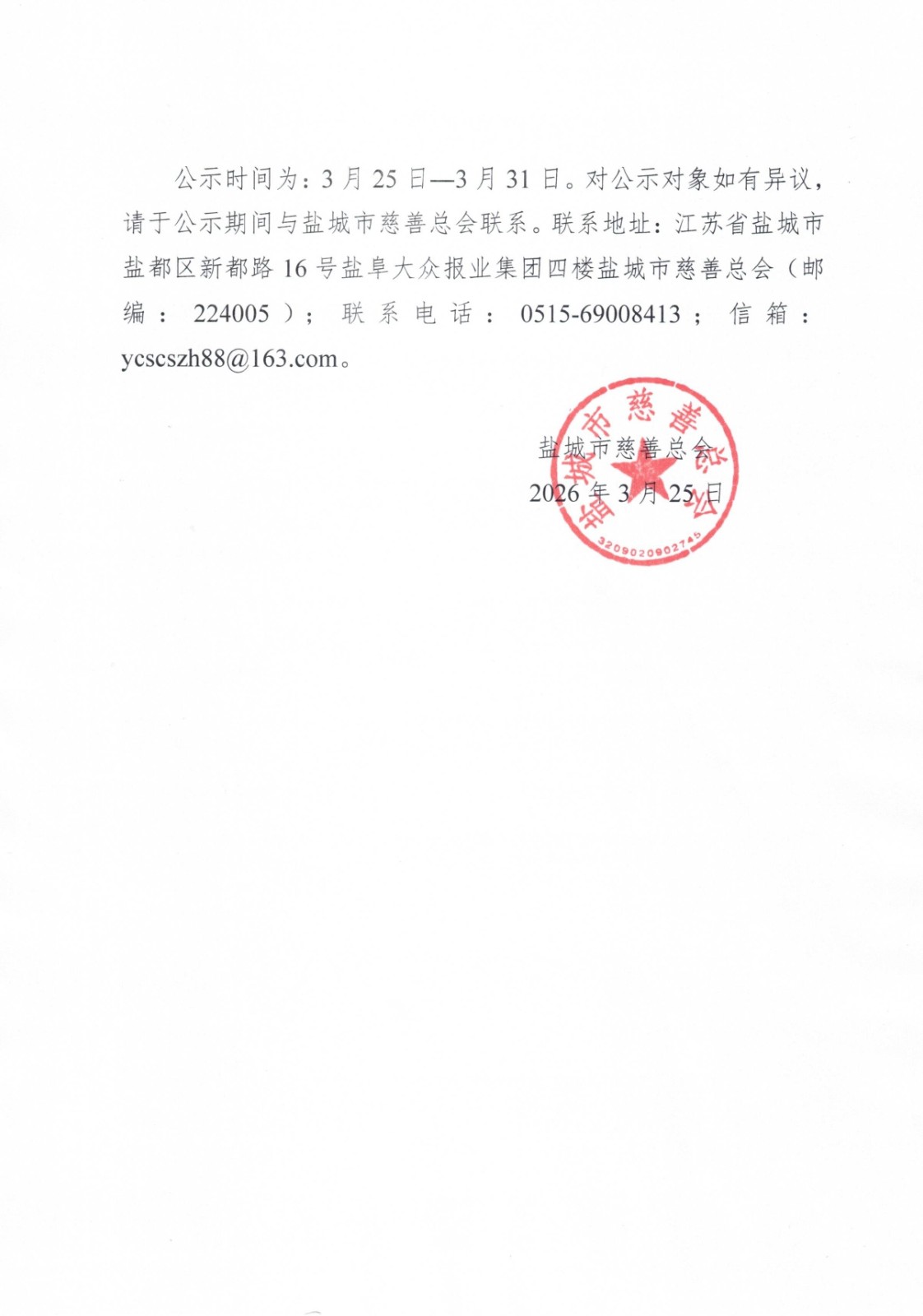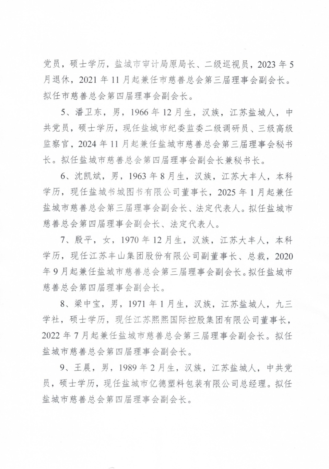 盐城市慈善总会第四届理事会负责人任职前公示