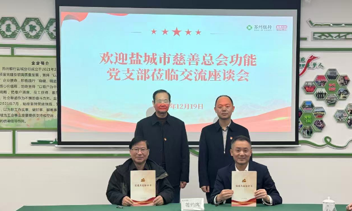 12月19日上午,市慈善总会与苏州银行盐城分行联合开展党建共建活动。市慈善总会原副会长、功能党支部副书记陈明、副秘书长黄兴港,苏州银行盐城分行副行长顾正富、工会主席王文政、机关党支部书记郑洪伟等参加活动。